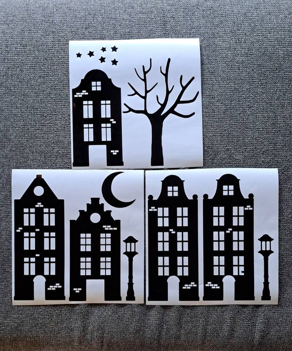 Leuk op het raam, maar ook op bijvoorbeeld een spiegel. Basisstraat van huisjes, eventueel uit te breiden voor Sinterklaas of Kerst. Alle figuren zijn los van elkaar te gebruiken.
