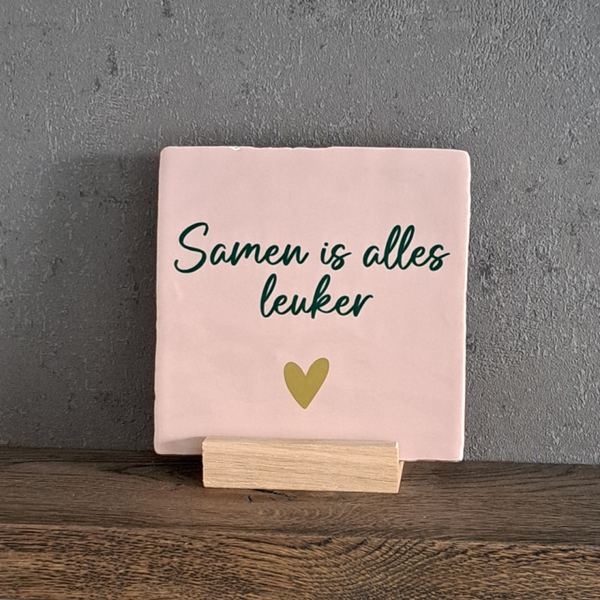 Tegeltje "Samen is alles leuker": roze tegeltje met forest en gold opdruk.
