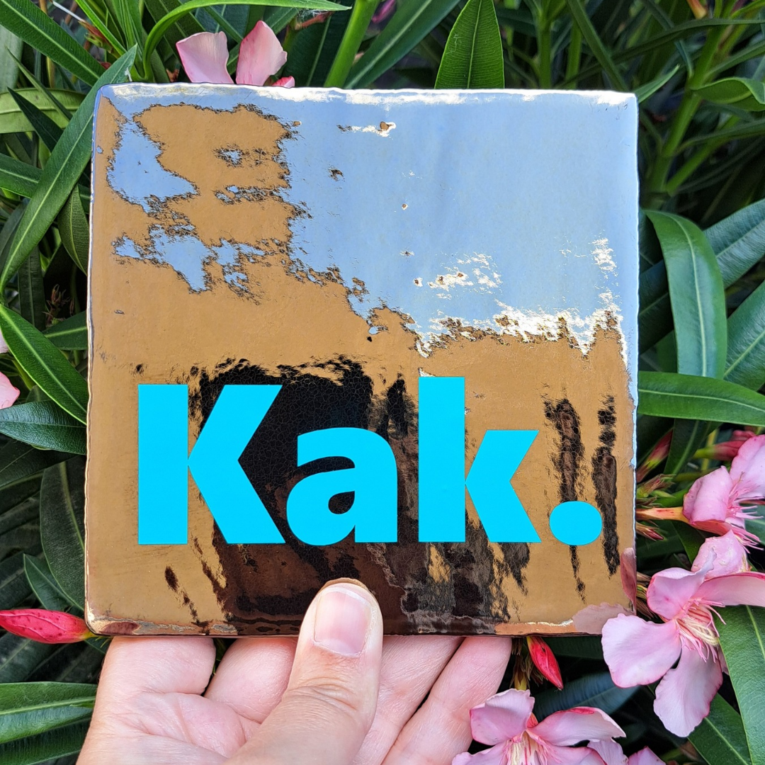 Tegeltje "Kak.": gouden tegeltje met turquoise opdruk.