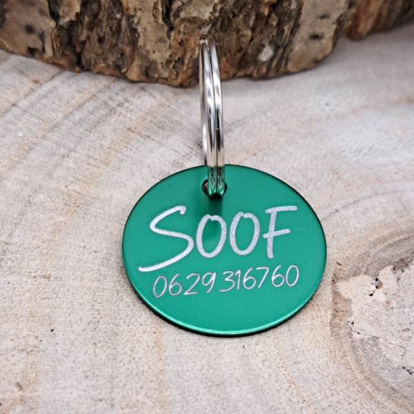 De penning wordt aan een ringetje bevestigd zodat je deze aan de halsband kunt vastmaken.