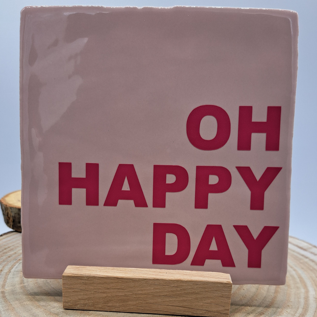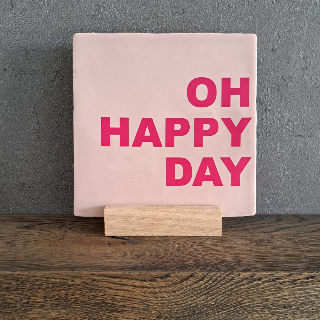 Tegeltje "Oh Happy Day": roze tegeltje met magenta opdruk.