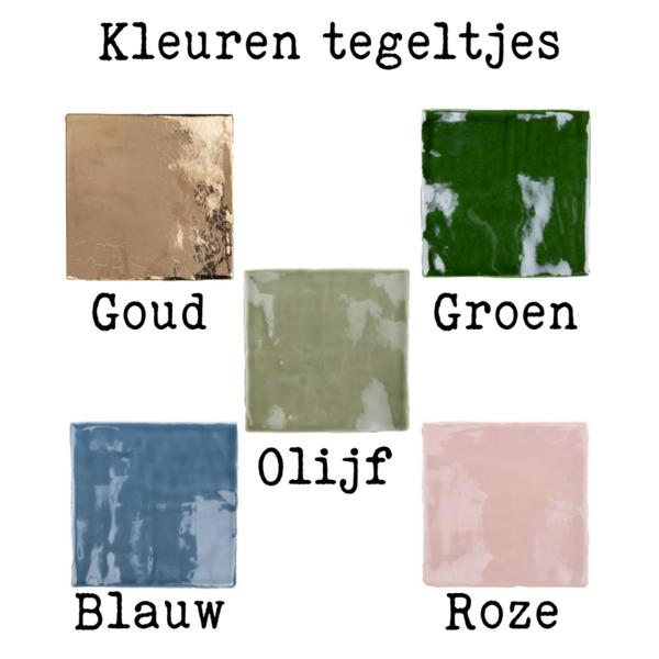 Liever een andere kleur tegel en/of kleur opdruk? Er zijn groene, gouden, roze, blauwe en olijfkleurige tegeltjes (zie foto). Daarnaast vind je tussen de afbeeldingen ook een overzicht van de mogelijke kleuren vinyl voor de opdruk. Vermeld bij de opmerkingen duidelijk welke wensen je hebt en ik maak je tegeltje helemaal naar wens.