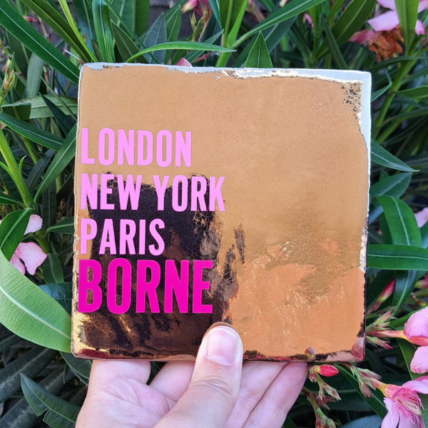 Tegeltje "London New York Paris + plaatsnaam": olijf tegeltje met wit en gold opdruk.